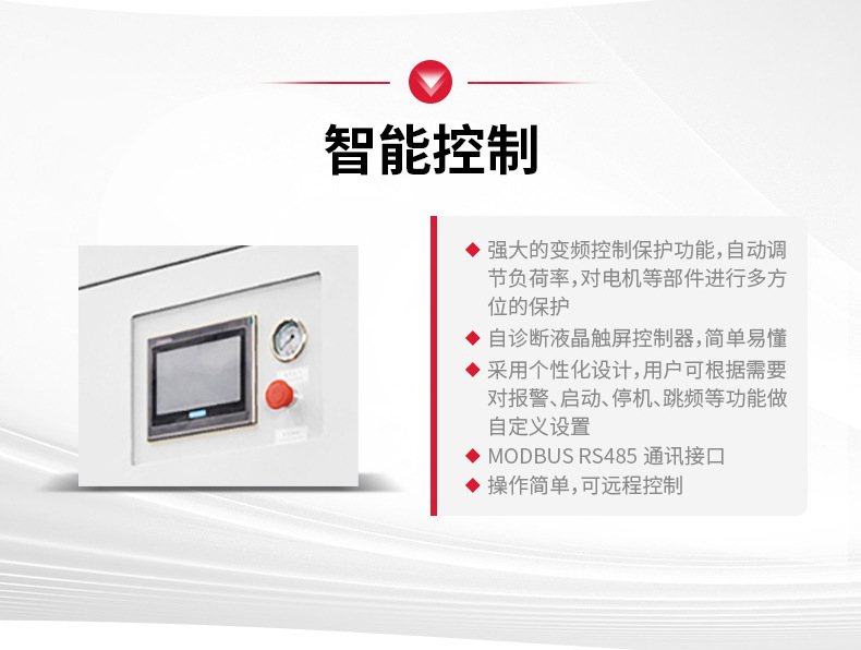 3、整个空气系统远程监测、联控、通信信号输出,保证气量稳定、压力恒定、自动调节;